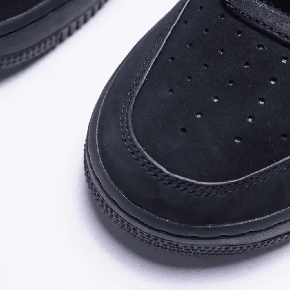 A parte superior do Air Force 1 Preto é confeccionada em couro premium, garantindo durabilidade, resistência e acabamento refinado. O icônico Swoosh da Nike e todos os detalhes são aplicados em preto, criando um visual monocromático que transmite simplicidade e sofisticação.